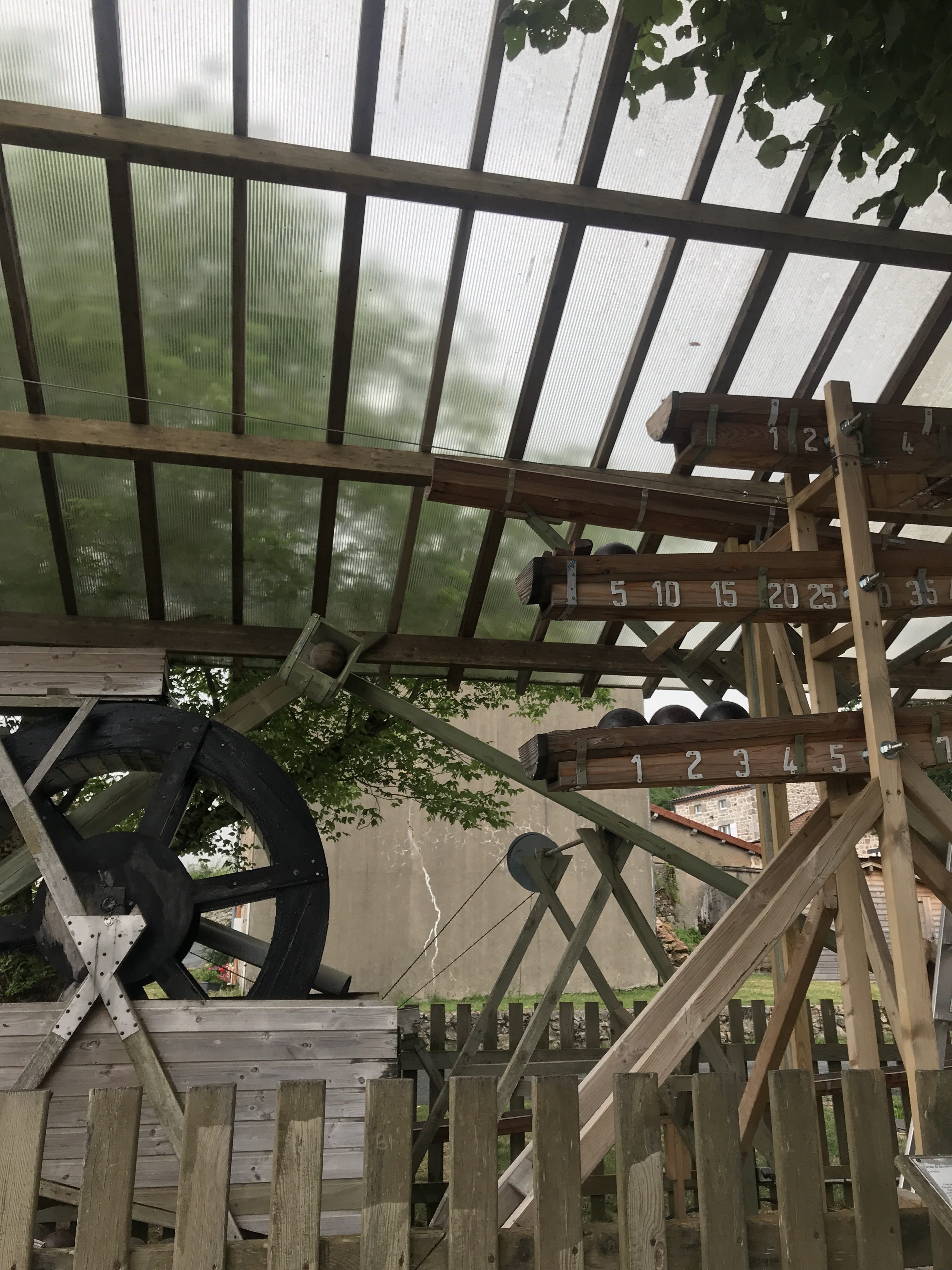 Bon, manque de chance, elle était un peu détraquée ce jour-là, et quelqu’un était en train de la réparer. Oui, car présents à 11 h 45, elle nous indiquait qu’il était 3 h 10… M’enfin on a pu voir comment cela fonctionnait et c’est assez impressionant, un joli mécanisme, porté par la roue à eau. Vraiment sympa à voir.