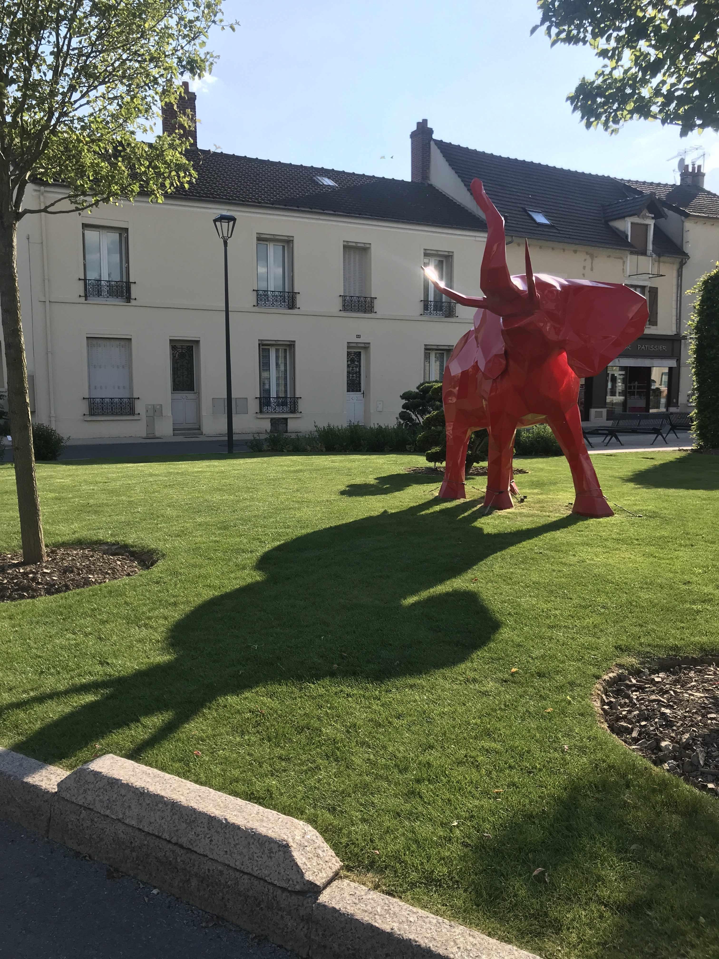 Le parvis de la mairie, quant à lui, était bien fleuri et une énorme statue d’éléphant, façon art moderne accueille le passant dans le jardin.