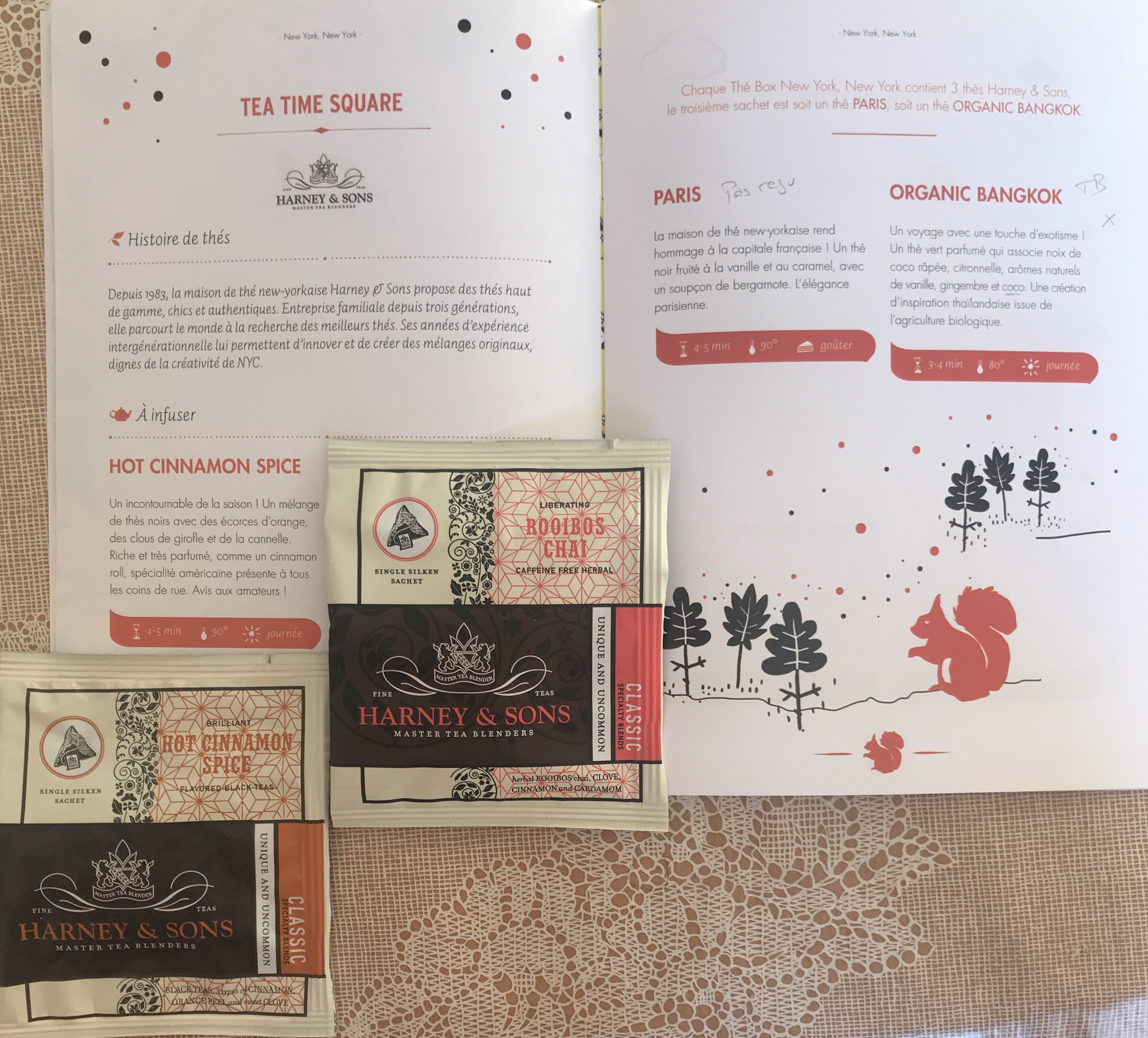 Harney and sons : le hot cinnamon spice qui est excellent, le rooibos chai très bien, le organic bangkok, avec de la coco, qui était très bien aussi et le Paris que je n’ai pas reçu.