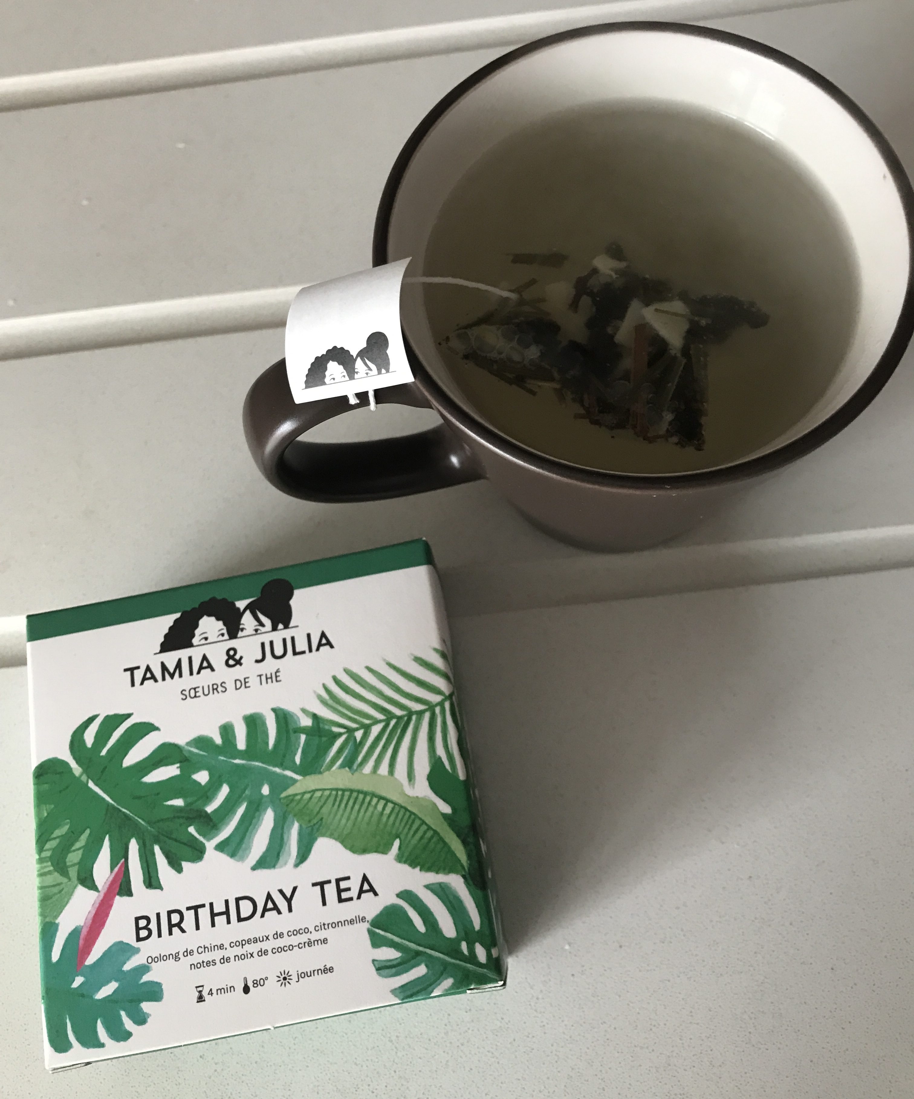 Le birthday tea de Tamia et Julia qui était léger pour un oolong de Chine ; un thé bleu vert faible en théine avec noix de coco et citronnelle.